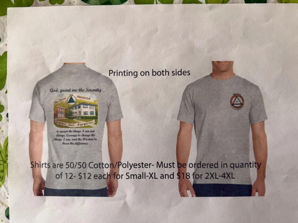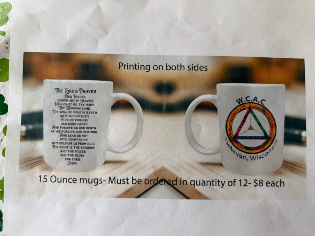 T-Shirts WCAC T-Shirts & Mugs Support and Showoff Our Club Shirts are 50/50 cotton/polyester.$12 each for Small-XL$18 2XL-4XL.T-Shirts have printing and graphics on both sides.Mugs are 15 Ounce.Lords Prayer on back of mug.Front of mug has beautiful, hand drawn, copy of stained glass unity circle.You do not need to order in quantity, this is a note to vender!These beautiful items are being sold at cost! Contact Harold H. at Noon or 6:30 meetings to order.Or call Soon these items will be available at the club!